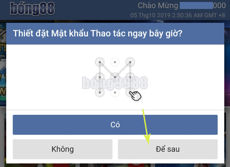 B2. Nếu đăng nhập thành công màn hình hiển thị hộp thoại “Thiết lập Mât Khẩu Thao tác ngay bây giờ?” Click “Để Sau“.
