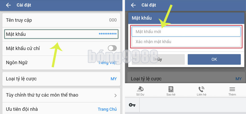 B4. Click vào dòng Mật khẩu (******), màn hình đổi mật khẩu bong88 hiện ra. Bạn nhập “mật khẩu mới” và “xác nhận mật khẩu mới“. Sau đó click “OK” để hoàn tất việc đổi mật khẩu bong88