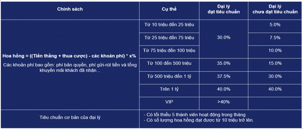 Hoa hồng = % * ((Tổng tiền thắng – thua cược) – các khoản phí)